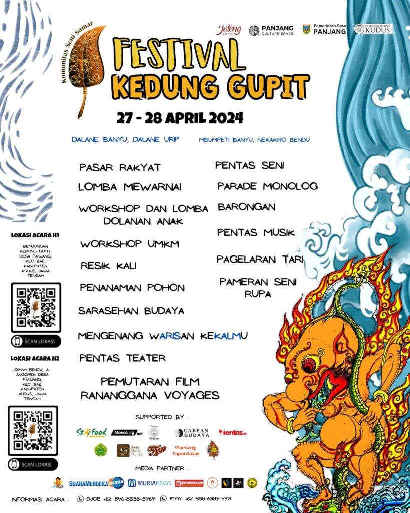 Festival Kedung Gupit bukan hanya tentang menyenangkan pengunjung dengan pertunjukan seni. Lebih dari itu, acara ini menjadi momen untuk memperkenalkan kembali kekayaan budaya yang melekat pada semesta sungai-sungai lokal. Seperti folklore, penjelajahan ruang mitologis sebagai ekspresi budaya dan pameran ekspresi budaya.